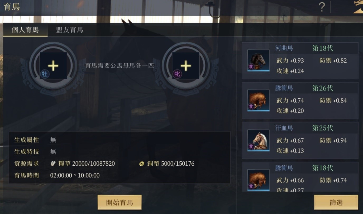 馬匹同樣可以保留到新賽季使用,新賽季開啟後建議把普通馬和一些品質較差的馬賣掉換取銅幣,只保留帶有特技的優質馬和少量低代優質種馬,在開啟育馬後能快速養成新的馬匹。裝備名同理,裝備鍛造望開啟條件比育馬更高,所以預留較好的裝備即可,後續鍛造時比較方便,普通的裝備直接出售,當然想留的話也可以留著。